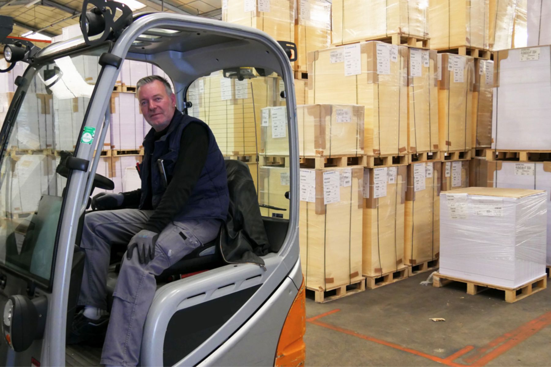 Quand ils arrivent de l’extérieur, je les réceptionne, les stocke, les déplace au besoin et les classe dans l’entrepôt grâce à des chariots élévateur. Je dois optimiser l’espace du magasin en plaçant les blocs de papier au bon endroit.